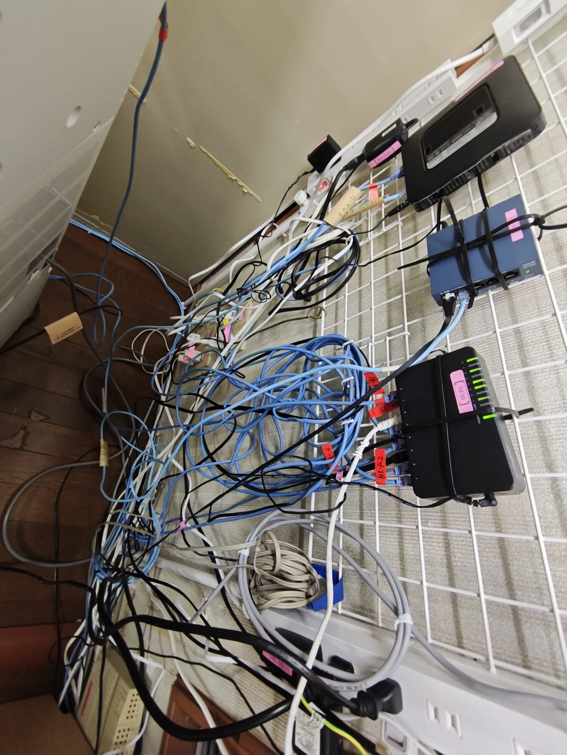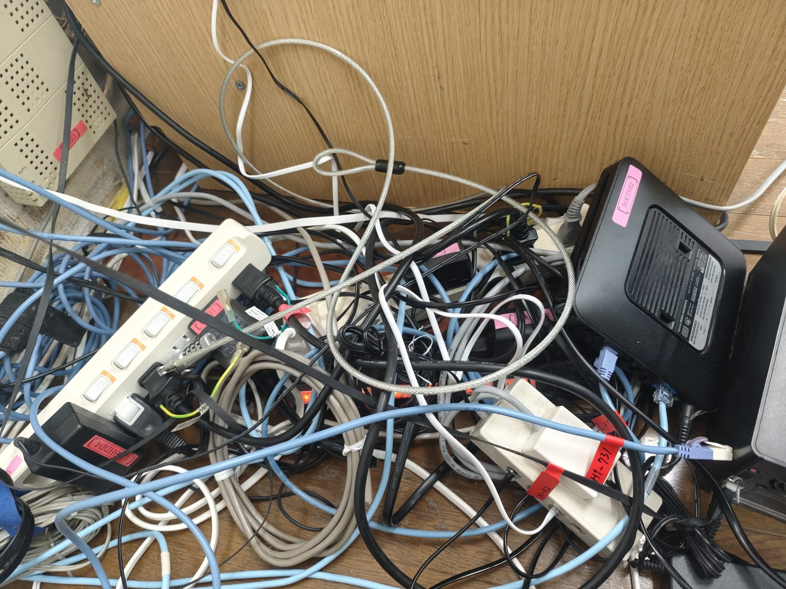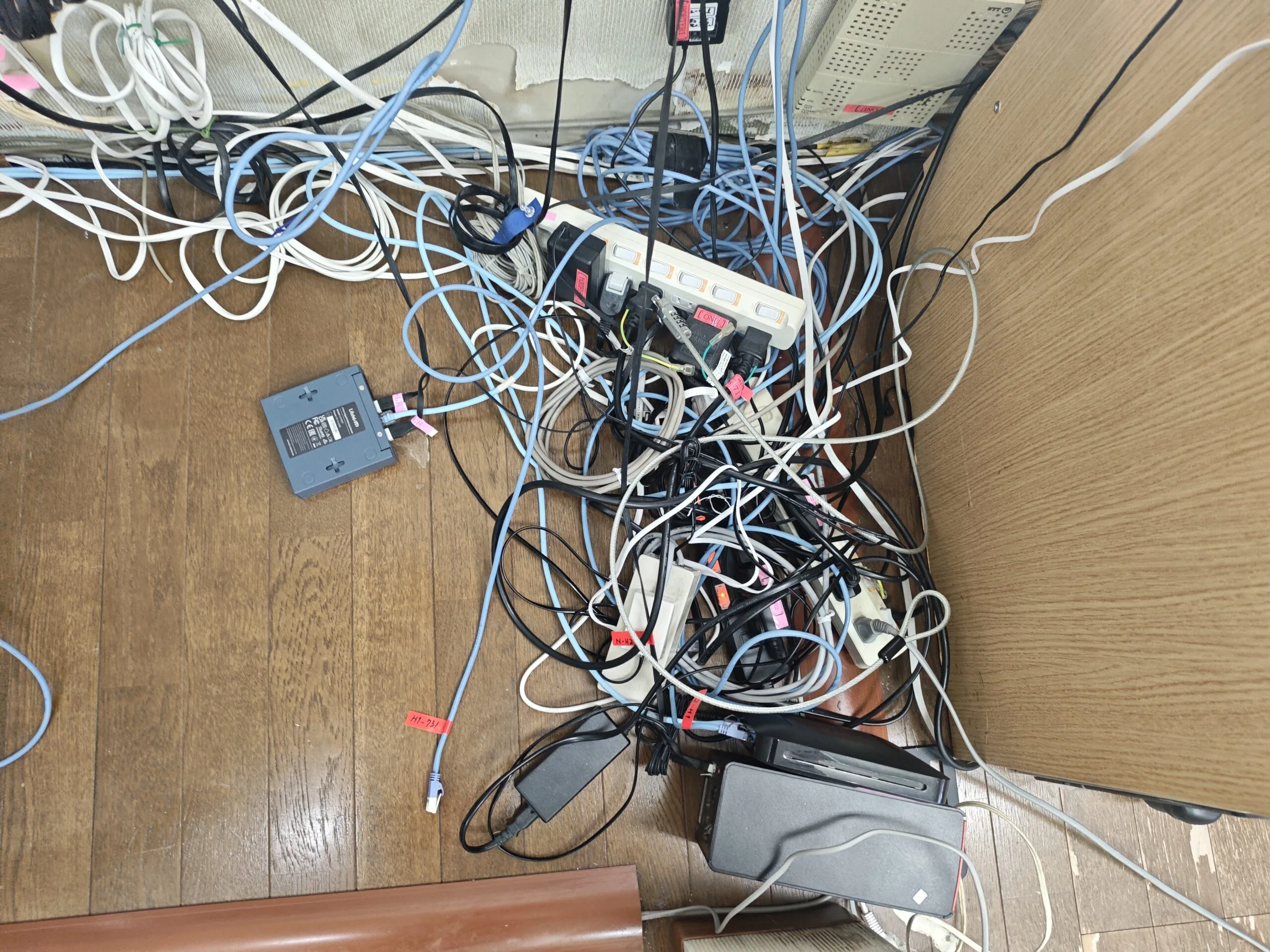 • 電源タップ/ACアダプタ/LANケーブル等が床面に集約し、配線が絡み合っている。