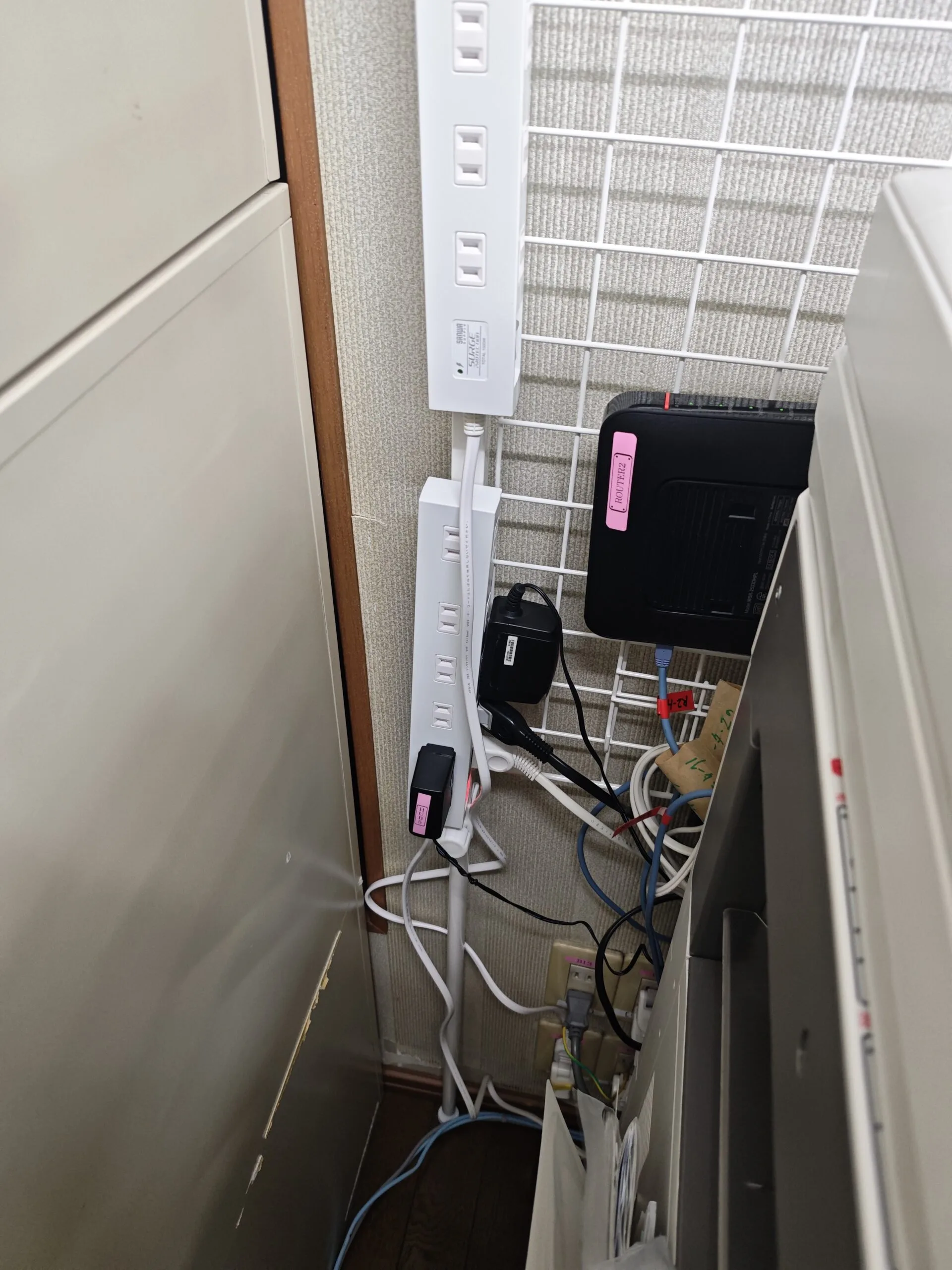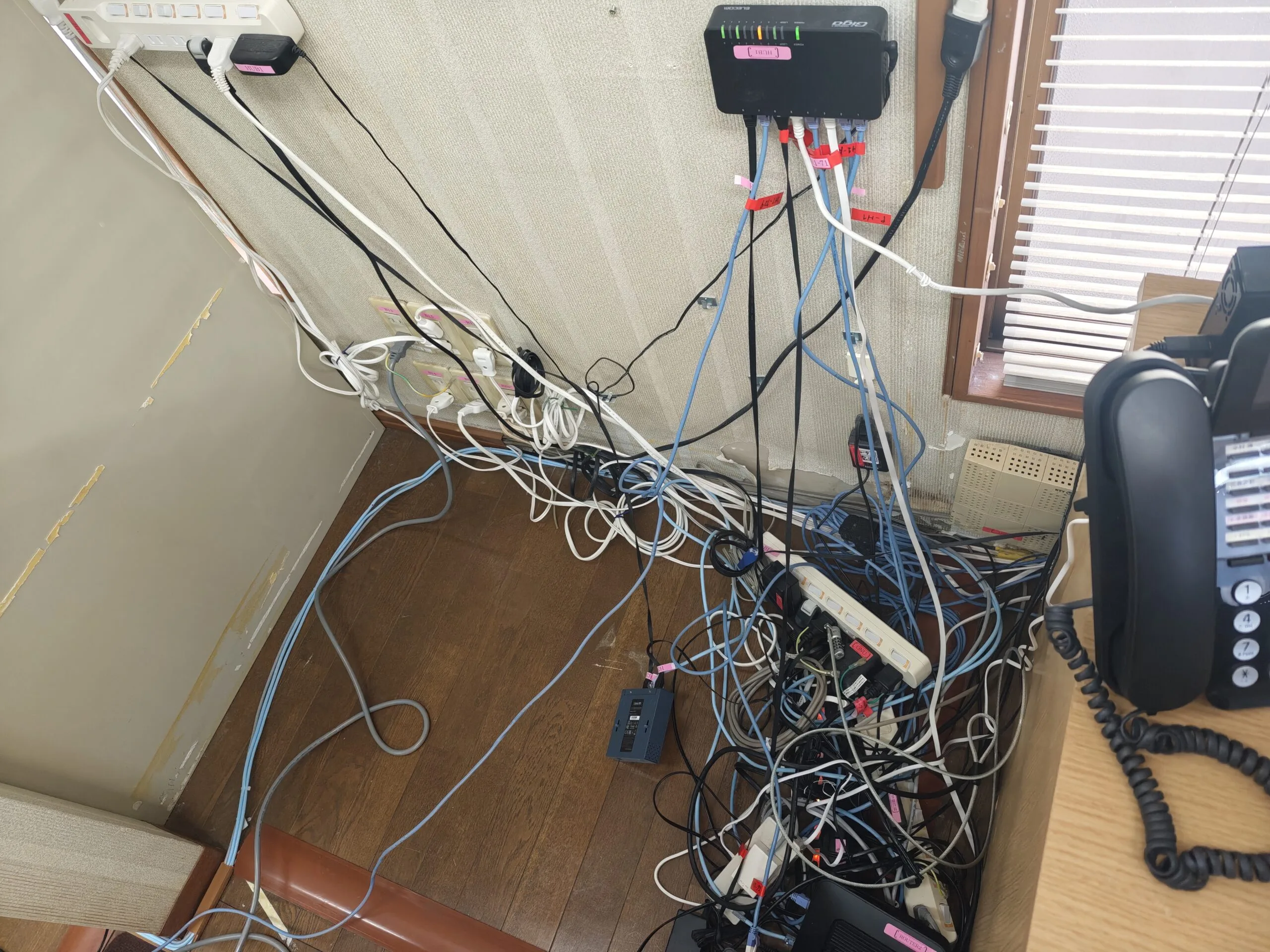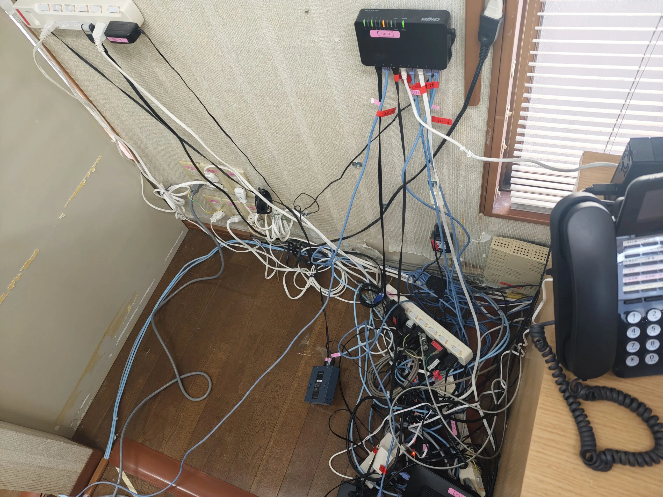 • 電源タップ/ACアダプタ/LANケーブル等が床面に集約し、配線が絡み合っている。